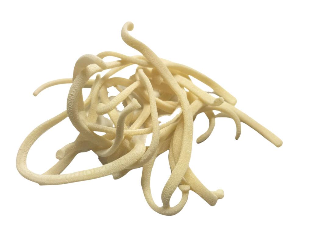 Questa pasta è caratterizzata da una forma piatta e allungata, simile a una linguina più larga e leggermente ricurva.
